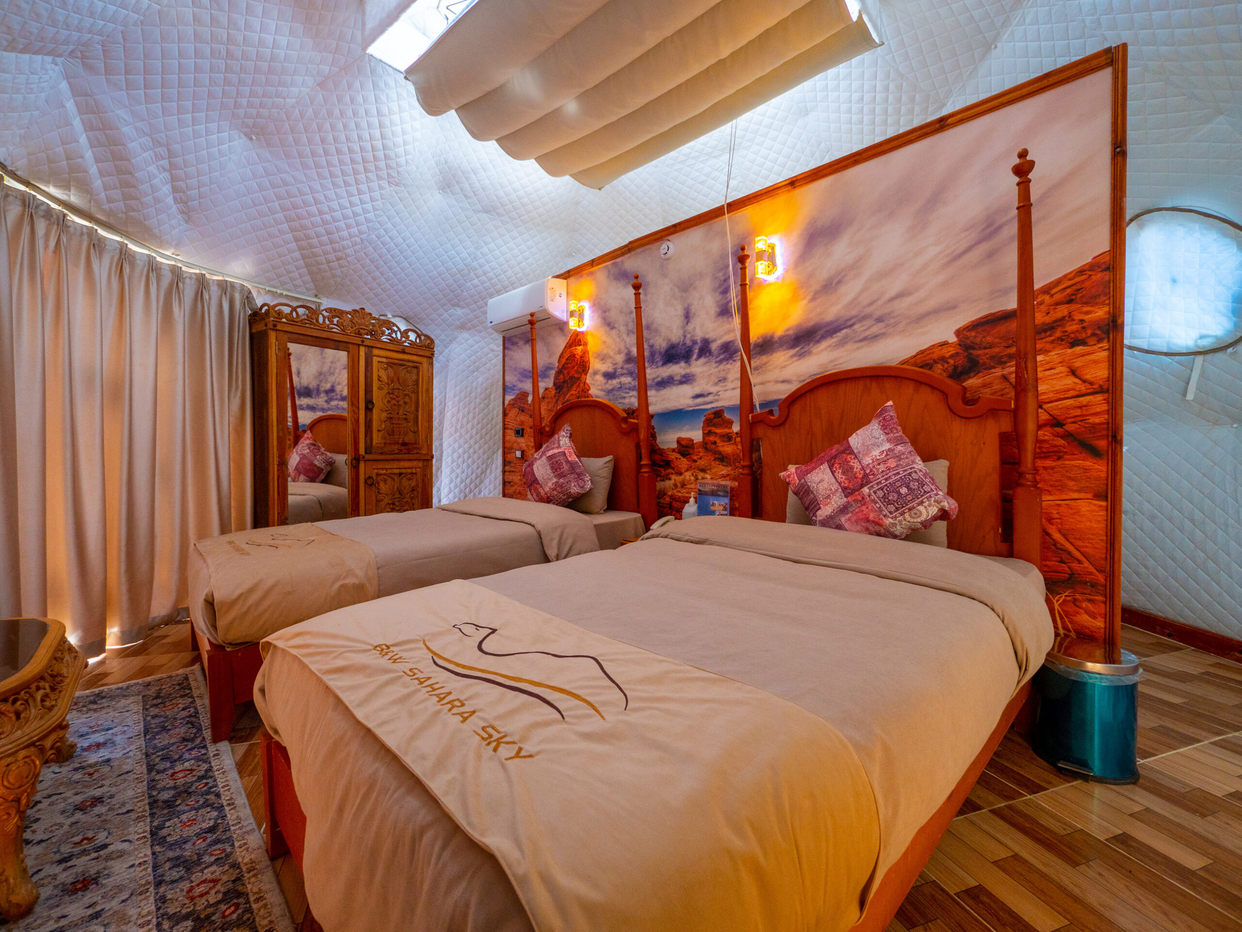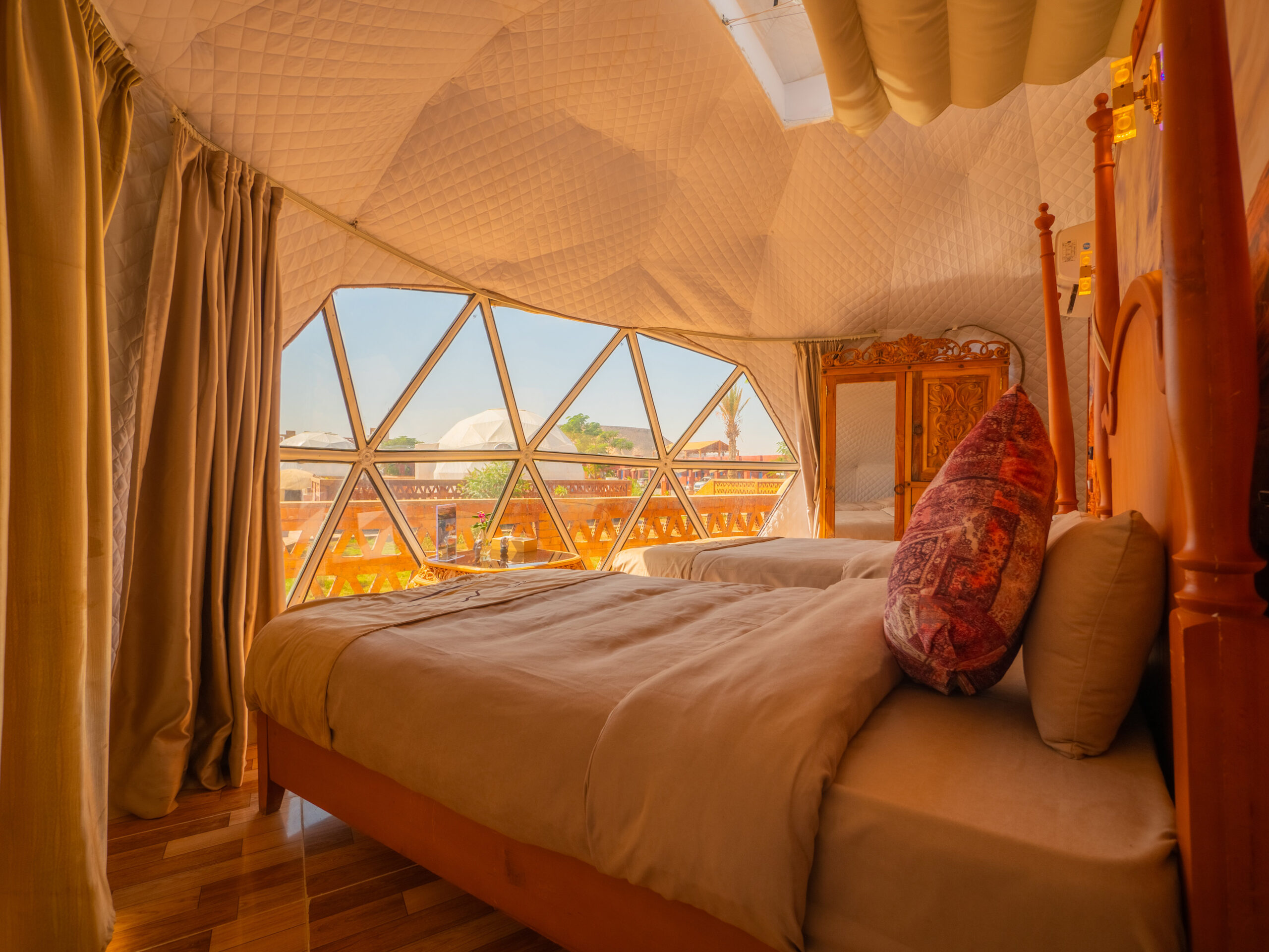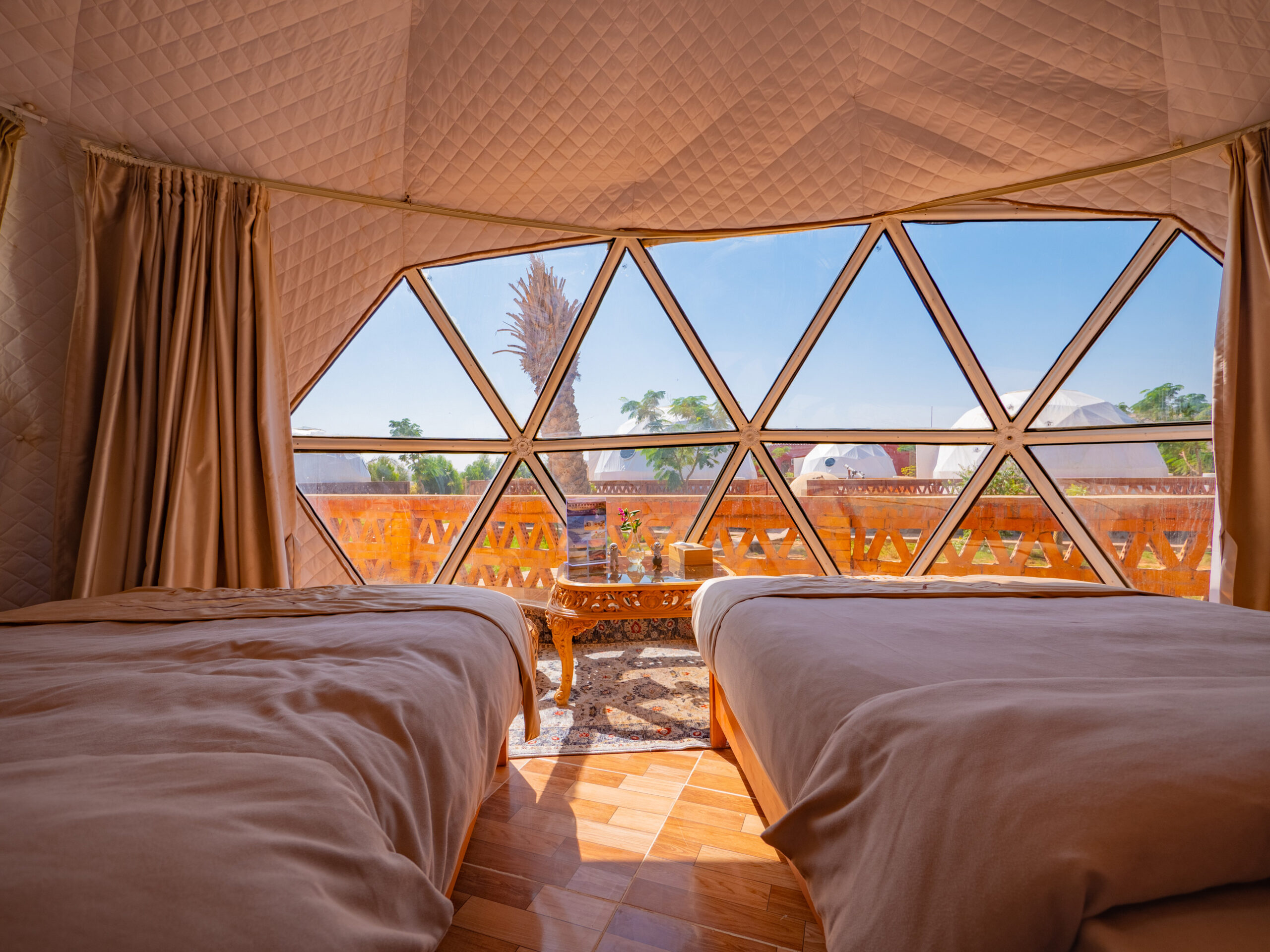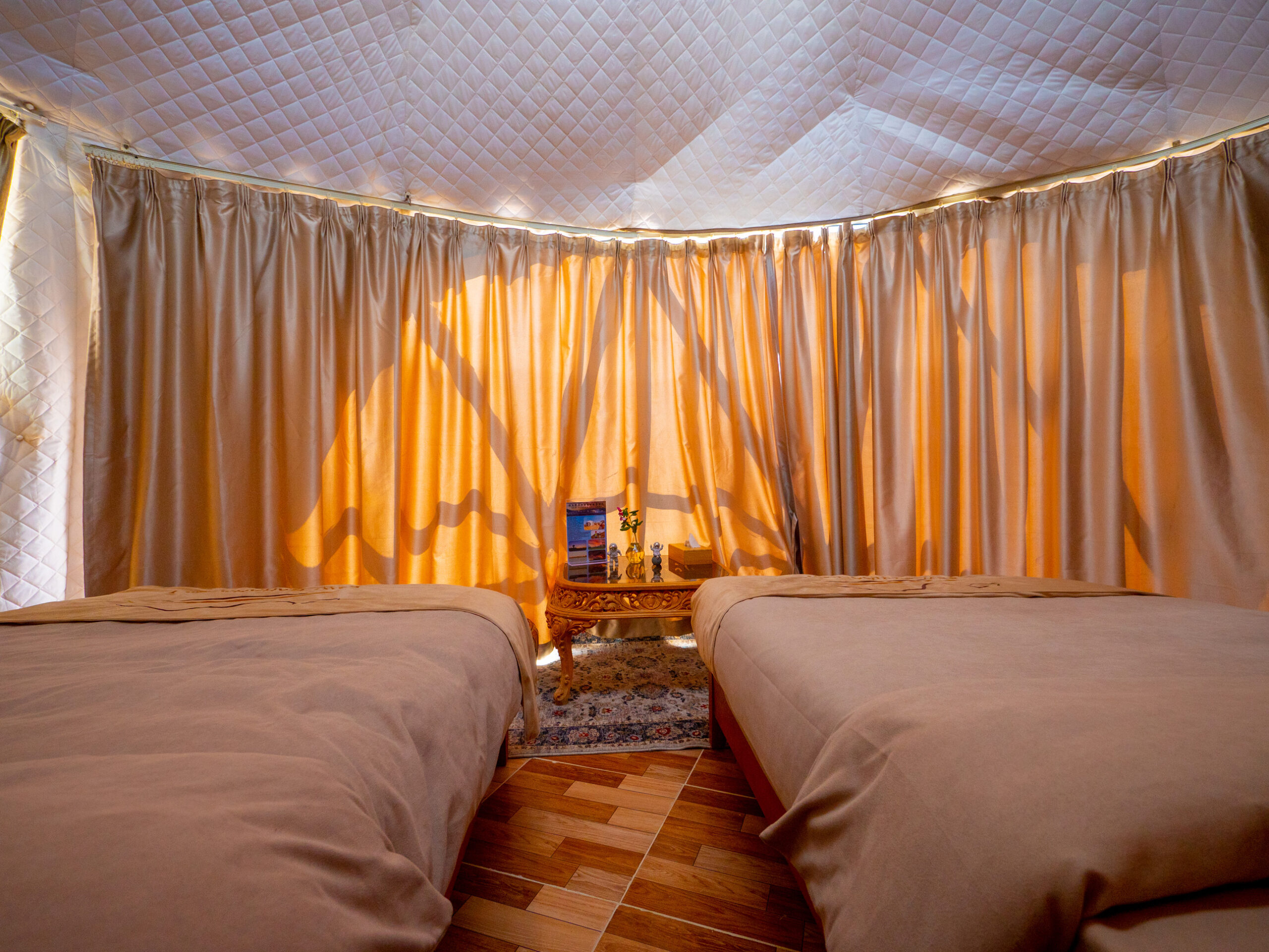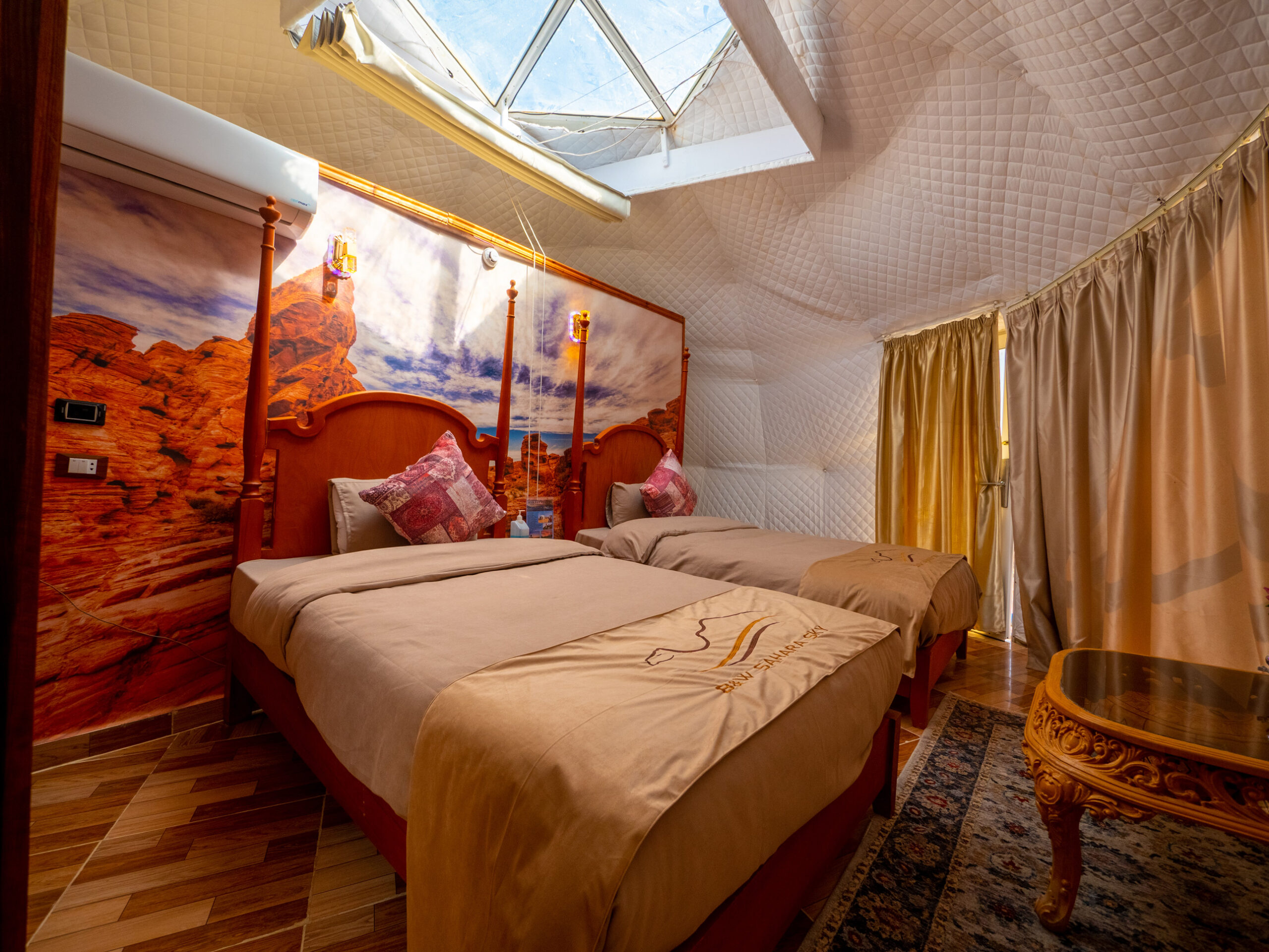 Our Starry Double Rooms come with 2 twin beds placed side by side with only a foot apart, a see-through ceiling for stargazing, a private bathroom (including a walk-in shower kit, towel/clothes hangers, heater, sink and toilet), a small table, water kettle, an in-room safe, wardrobe, outdoor terrace, complimentary Wi-Fi internet access, daily housekeeping and air-conditioning (cold/hot).